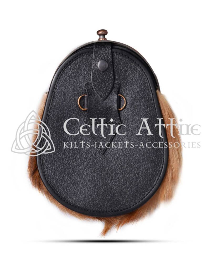 Functionality meets style with this sporran. It offers ample storage space for your essentials, ensuring you have everything you need at hand. A durable leather back enhances its longevity, making it a reliable choice for any occasion. The Fox Fur Dress Sporran comes with a matching chain strap for easy attachment to your kilt. Three elegant tassels hang from the front, adding a classic touch that enhances its overall aesthetic.
