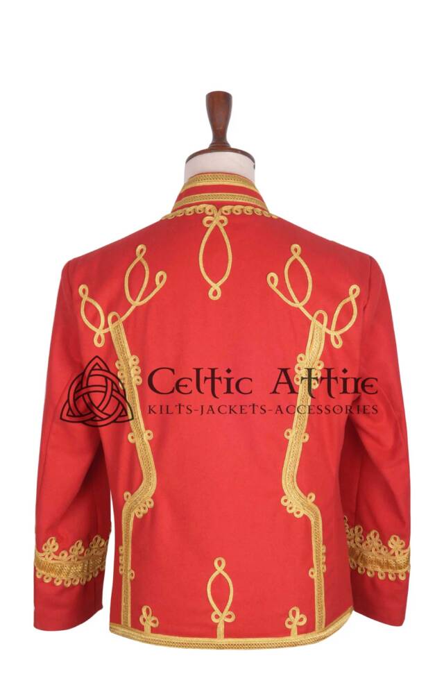 - Meticulously stitched gold braids create intricate detailing and contrast against the red wool