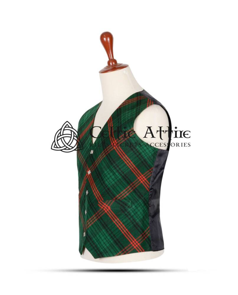 The Ross Hunting Modern Tartan Vest includes five-button fastening, ensuring a secure and stylish fit. Two front pockets add practicality, allowing you to carry essentials like your phone or keys with ease. The traditional black satin back enhances the vest’s overall sophistication.