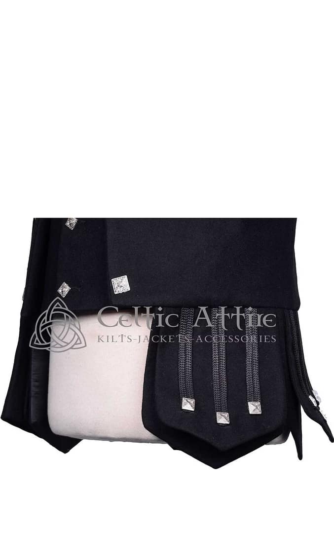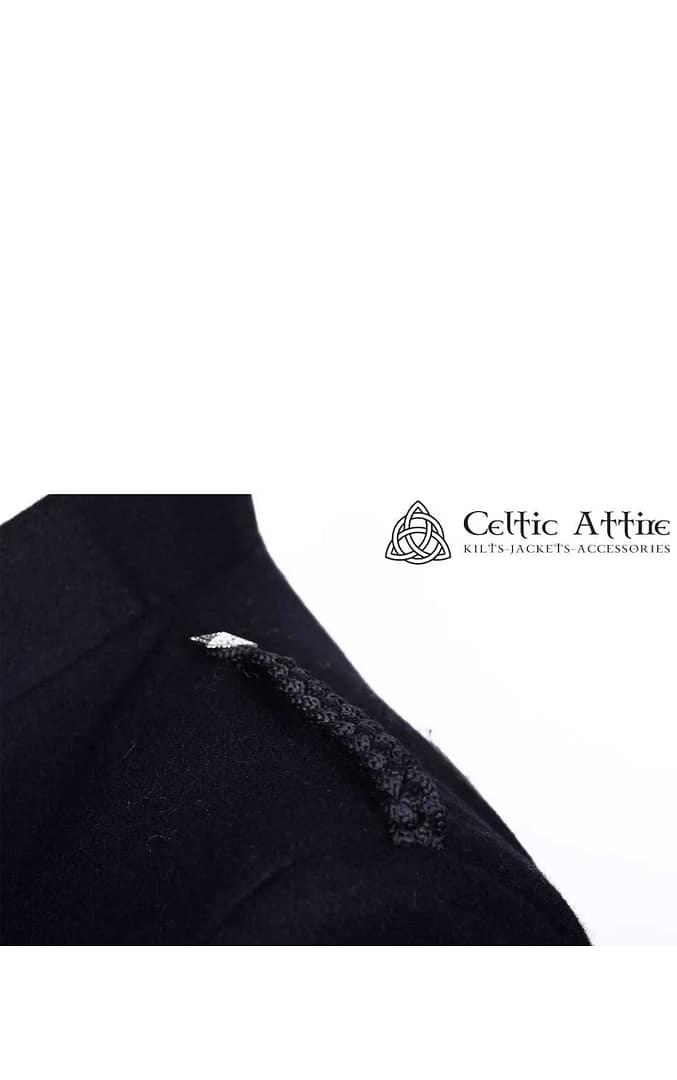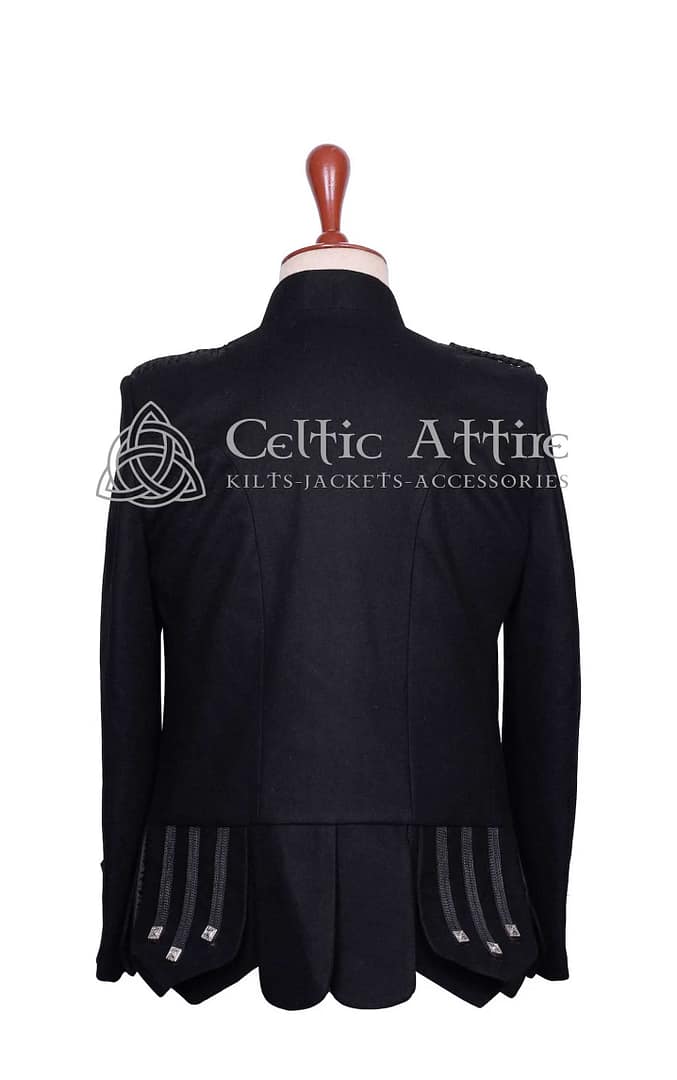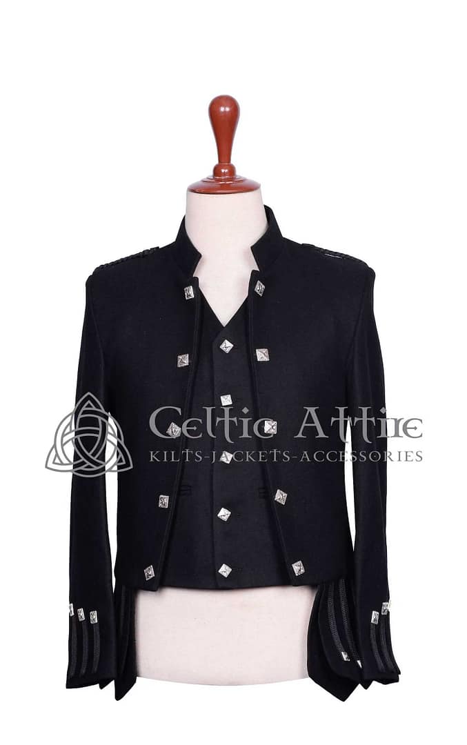 Our Scottish Sheriffmuir Doublet Jacket and Waistcoat in Black Barathea is a tailored formal evening jacket. It is made using Blazer Wool and has a high collar, is fastened at the top button and has a curved cut-away front featuring 5 Celtic buttons on either side.