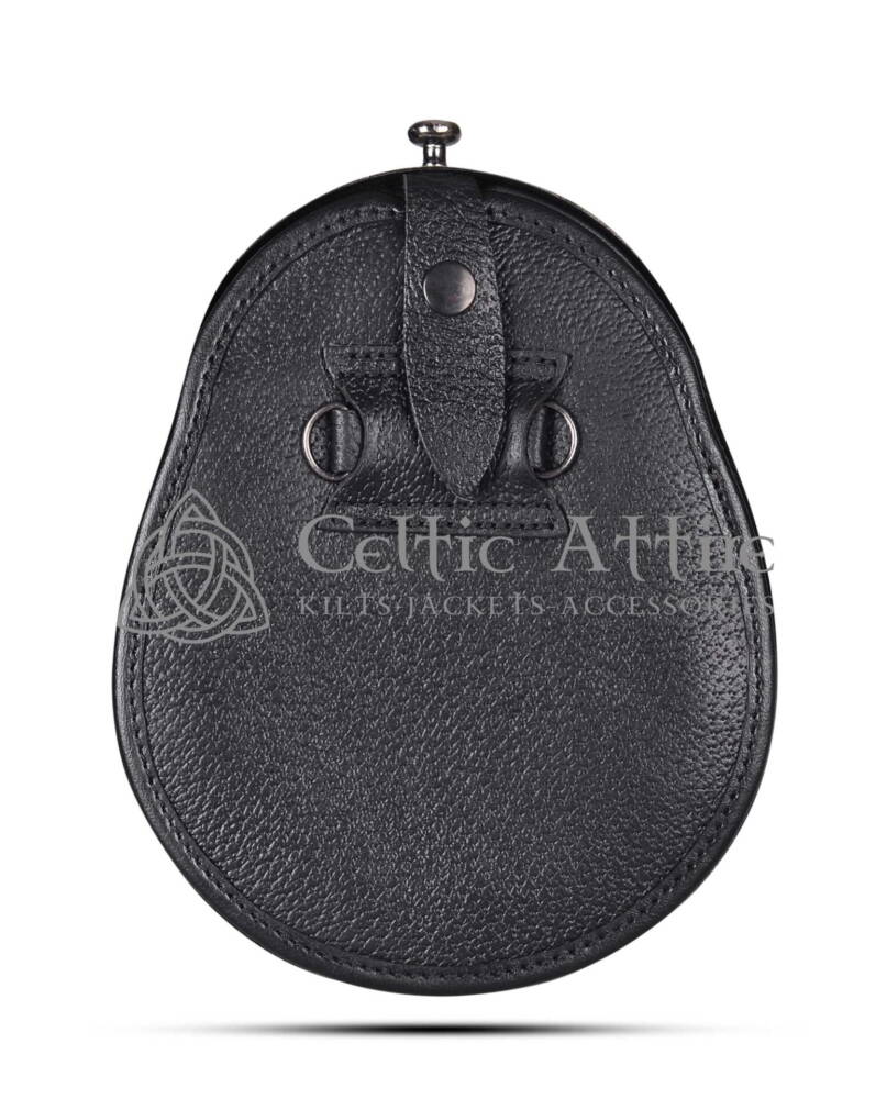 The sporran’s pouch is made from high-quality leather and features a stud fastening for secure closure. It is designed to be worn at the front of the kilt, providing both style and functionality. The sporran comes with an antique finish chain strap, allowing easy attachment to the kilt. The chain strap serves a practical purpose and contributes to the ensemble’s overall aesthetic.