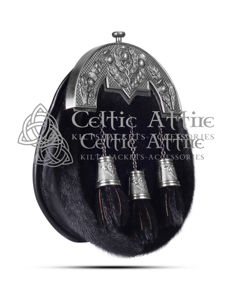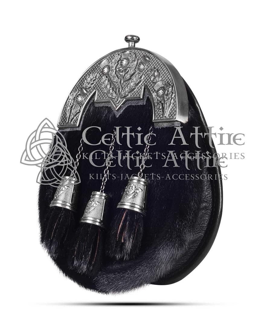 The Black Seal Fur Antique Thistle Cantle Full Dress Sporran is a traditional Scottish accessory worn with a kilt. This sporran features a black seal fur pouch and an antique finish cantle adorned with a thistle motif, a symbol closely associated with Scotland.