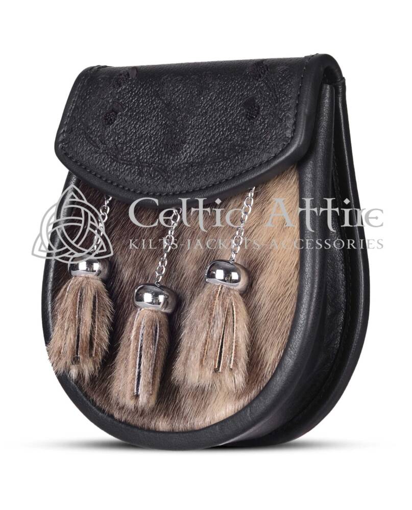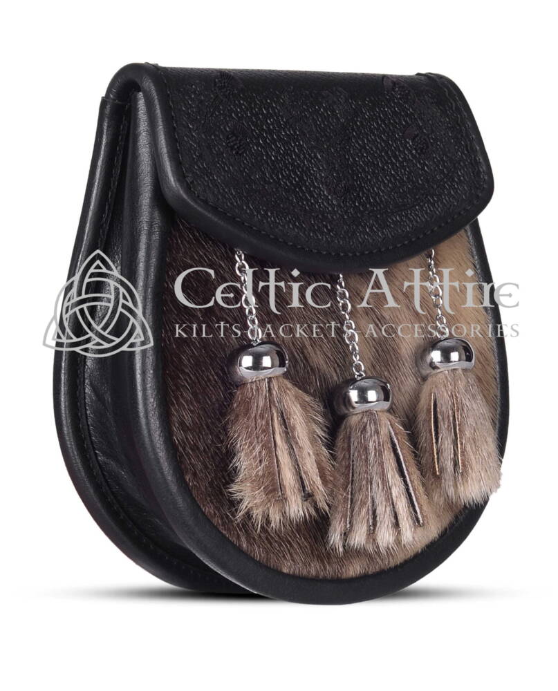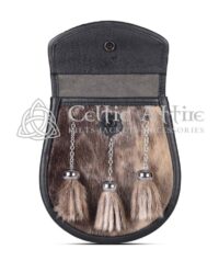Designed for versatility, the sporran features three decorative rabbit fur tassels with metal chains, adding movement and flair to your look. Measuring 6.5 Inches x 7.5 Inches, it provides ample space for your essentials while maintaining a compact silhouette. Whether you’re attending a wedding, a festive celebration, or a formal event, the Black Rabbit Fur Sporran is the ideal accessory to complete your outfit with a touch of Scottish charm and elegance.