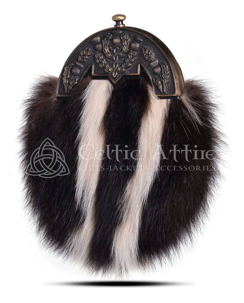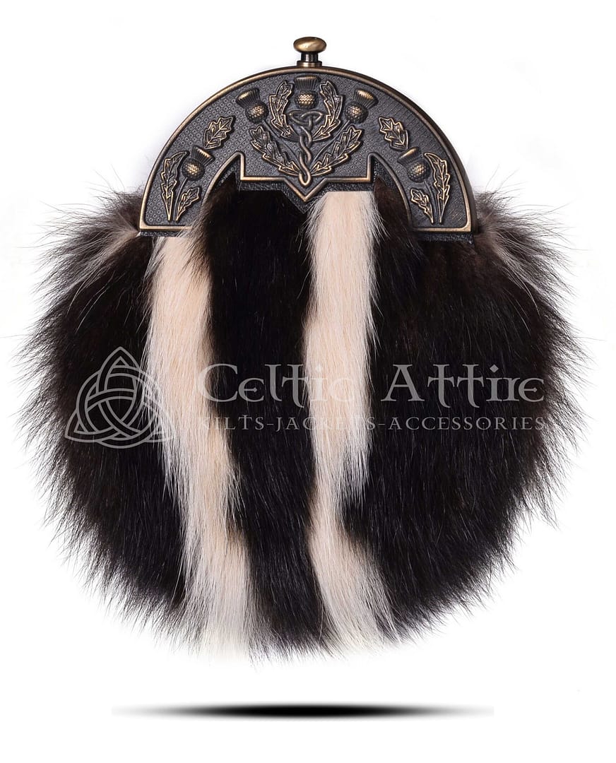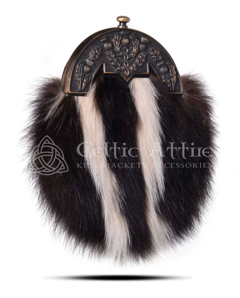 This sporran features a beautifully designed brass thistle cantle, symbolizing Scottish heritage. The thistle is not only a national emblem but also represents resilience and beauty. The craftsmanship of the cantle complements the softness of the skunk fur, creating a harmonious balance between ruggedness and refinement.Designed for practicality, the Skunk Fur Dress Sporran includes a spacious interior. It provides ample room for essentials like wallets, keys, and other small items, making it functional as well as stylish. The adjustable chain strap ensures a comfortable fit, allowing you to wear it at your desired height.Whether you are attending a wedding, a Highland games event, or a formal gathering, this sporran enhances your outfit with its distinctive flair. It pairs beautifully with kilts and other traditional Scottish garments.