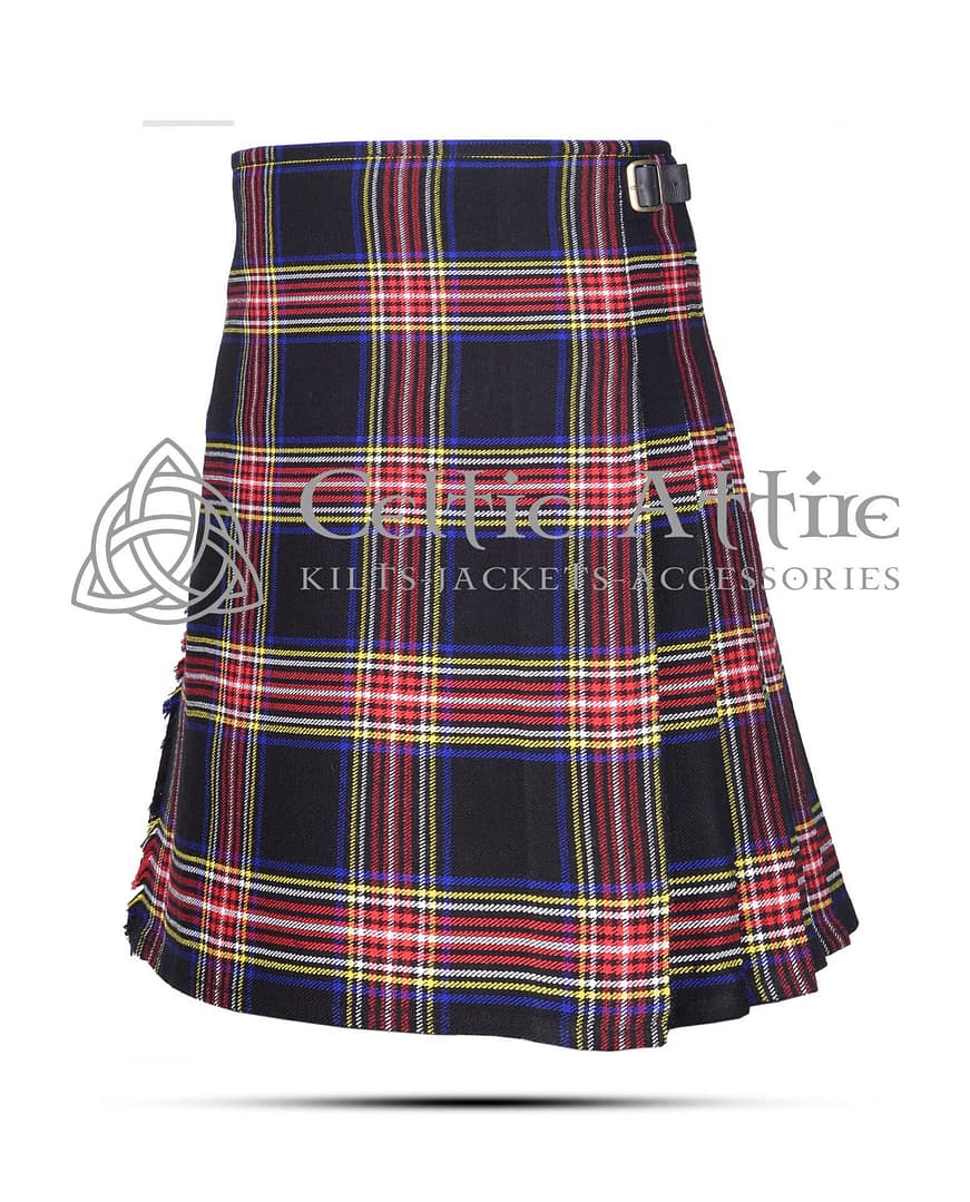 The Stewart Black Tartan Kilt is a distinguished garment that embodies Scottish heritage and elegance. This kilt features the classic Stewart Black tartan, known for its striking pattern of black and dark blue lines, accented with thin red and white stripes. Crafted from high-quality acrylic wool, this kilt ensures both comfort and durability, making it suitable for various occasions.