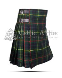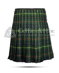 The design includes knife pleats that allow for ease of movement, making it ideal for dancing or active wear. The pleats are sewn down at the hips, creating a sleek silhouette. Genuine leather straps and rust-free buckles secure the kilt, ensuring it remains stylish and functional.