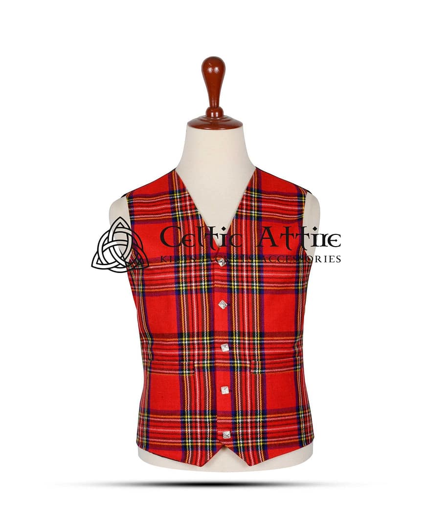 Introducing the Stewart Royal Tartan Waistcoat, a sophisticated piece that pays homage to the rich heritage of the Stewart clan. Crafted from premium fabric, this waistcoat features the striking Stewart Royal tartan. Characterized by vibrant blues, deep greens, and rich reds. Its classic design makes it an excellent choice for those who appreciate timeless elegance combined with modern style.