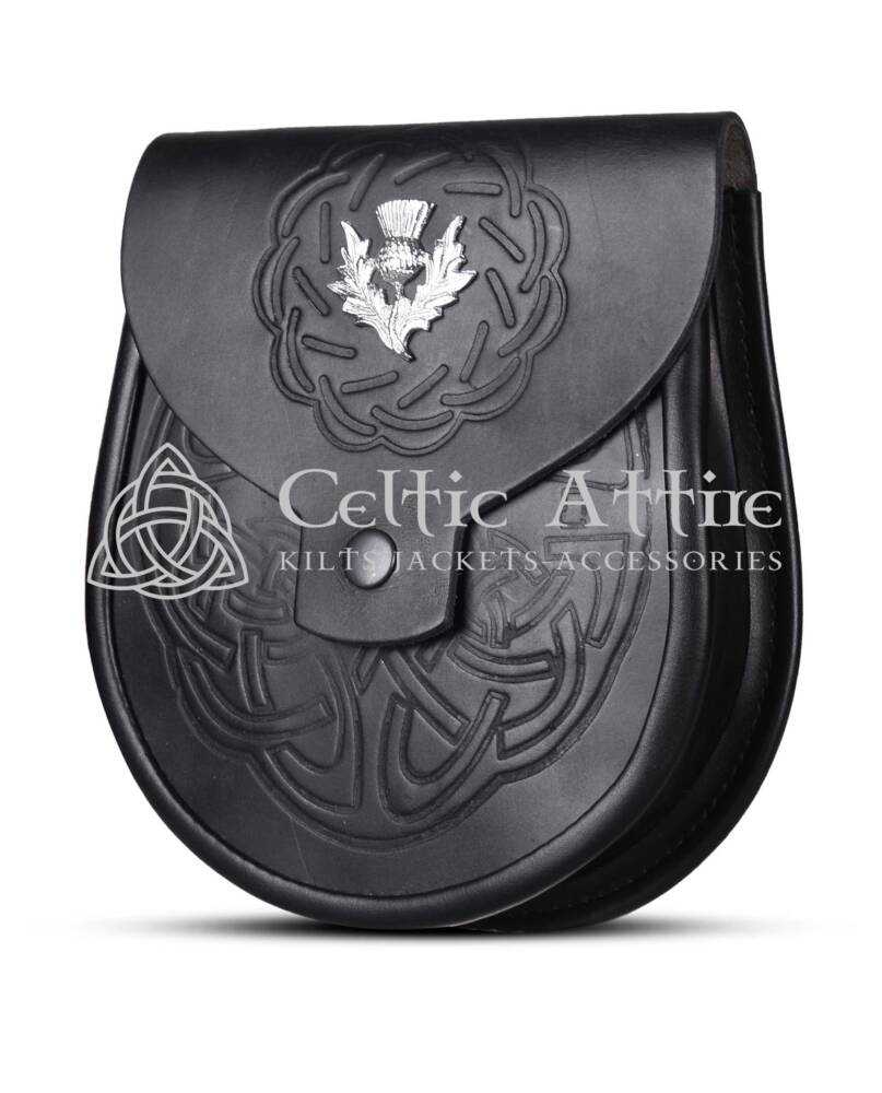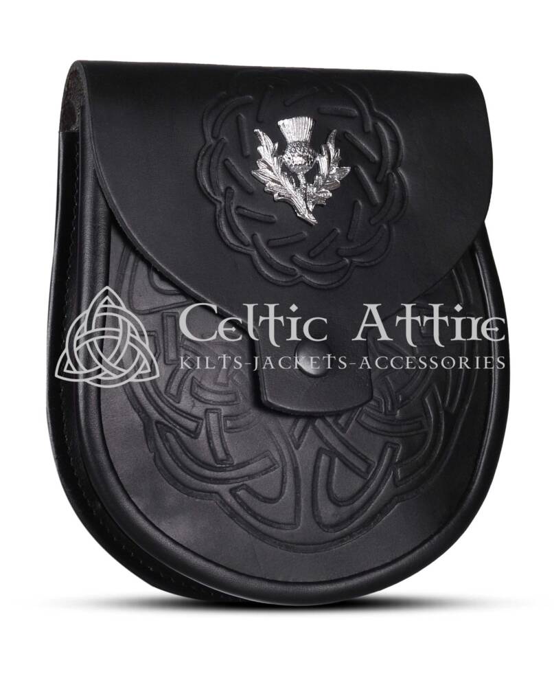 The Thistle Emblem Full Embossed Day Sporran embodies the rich heritage of Scotland with its intricate design and timeless elegance. Crafted from premium leather, this sporran boasts a luxurious feel and exceptional durability, ensuring it withstands the test of time. The full embossed detailing of the iconic Scottish thistle emblem adorns the front, symbolizing resilience and pride.