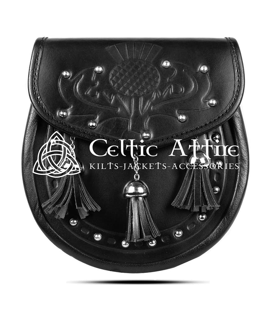Whether worn as part of traditional Highland attire or to add a touch of Scottish flair to modern outfits, the Thistle Embossed Black Leather Day Sporran effortlessly blends functionality with sophistication, making it a versatile accessory for various occasions.