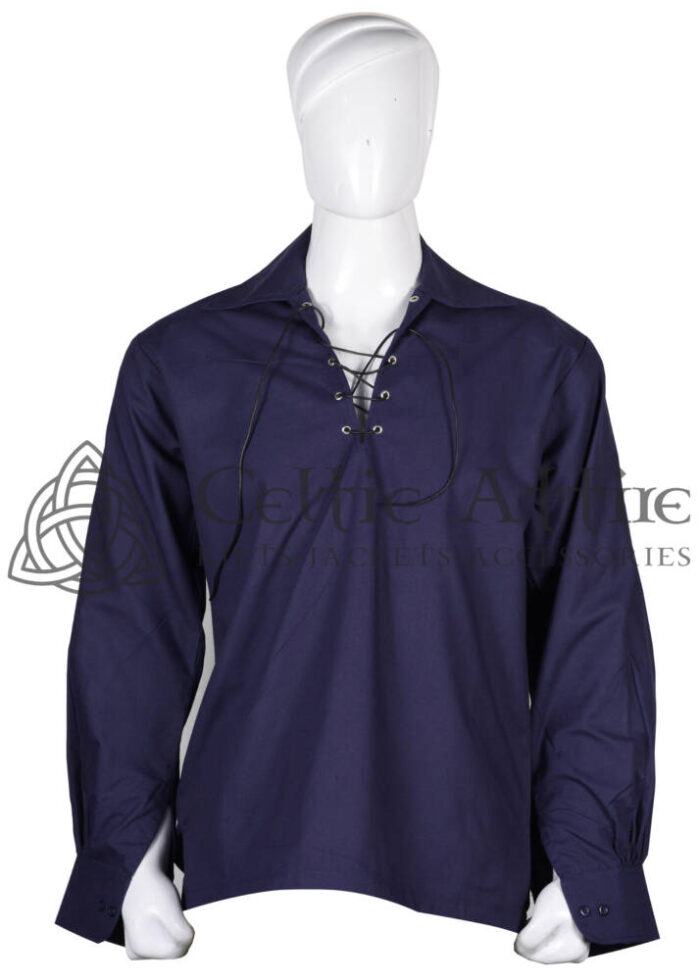 The traditional Scottish Ghillie Jacobite kilt shirt, crafted entirely from 100% cotton, embodies the essence of Highland heritage and style. With its characteristic lace-up front and loose, comfortable fit, this shirt epitomizes the timeless elegance of Scottish attire. Its design, rooted in centuries of tradition, evokes images of rugged landscapes, ancient clans, and the spirit of the Scottish Highlands. Made from breathable cotton fabric, it offers both durability and comfort, ideal for wearing in a variety of settings, from formal gatherings to casual outings.