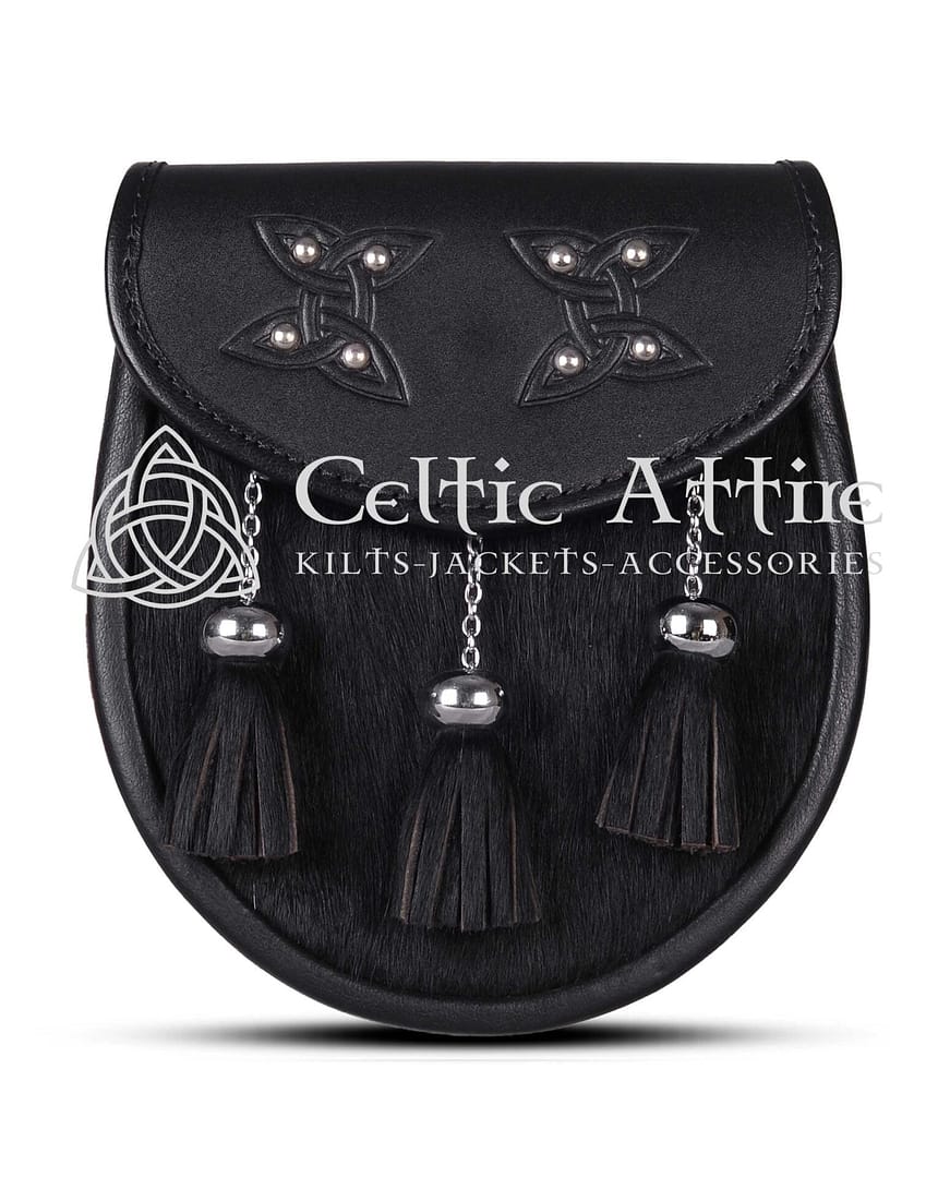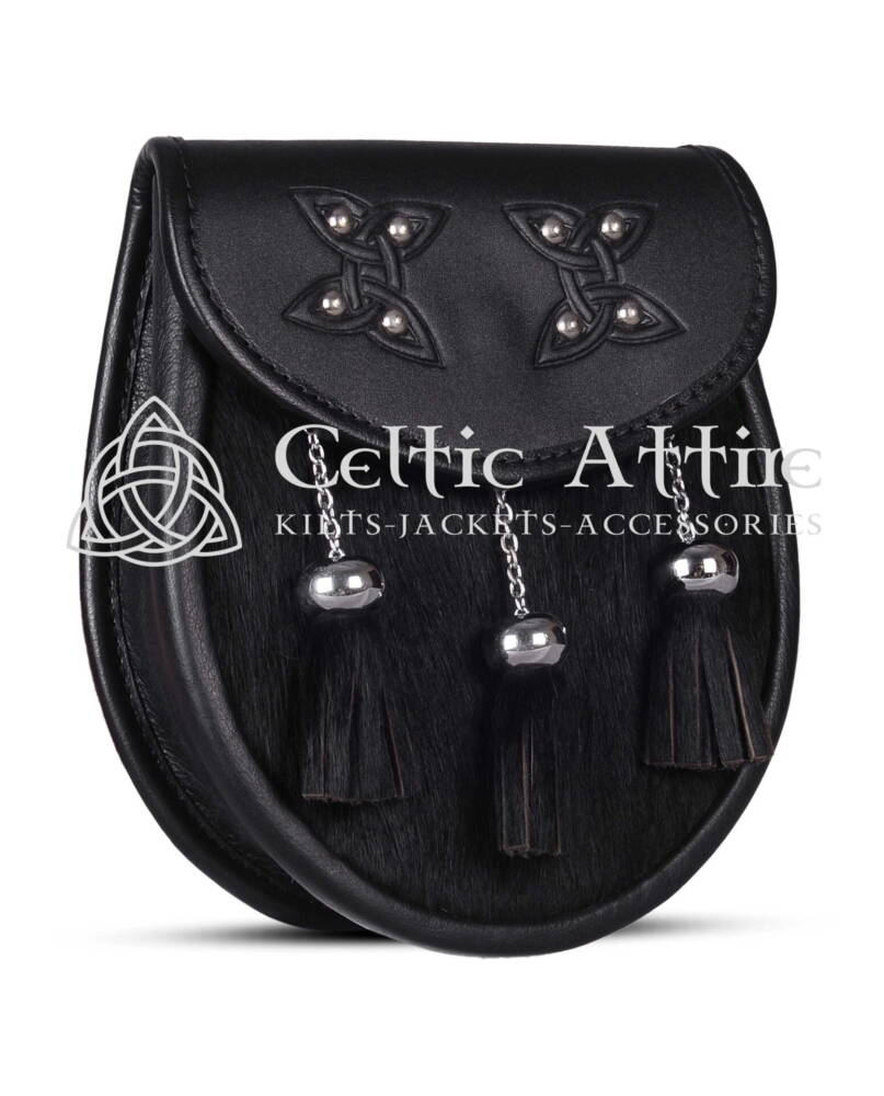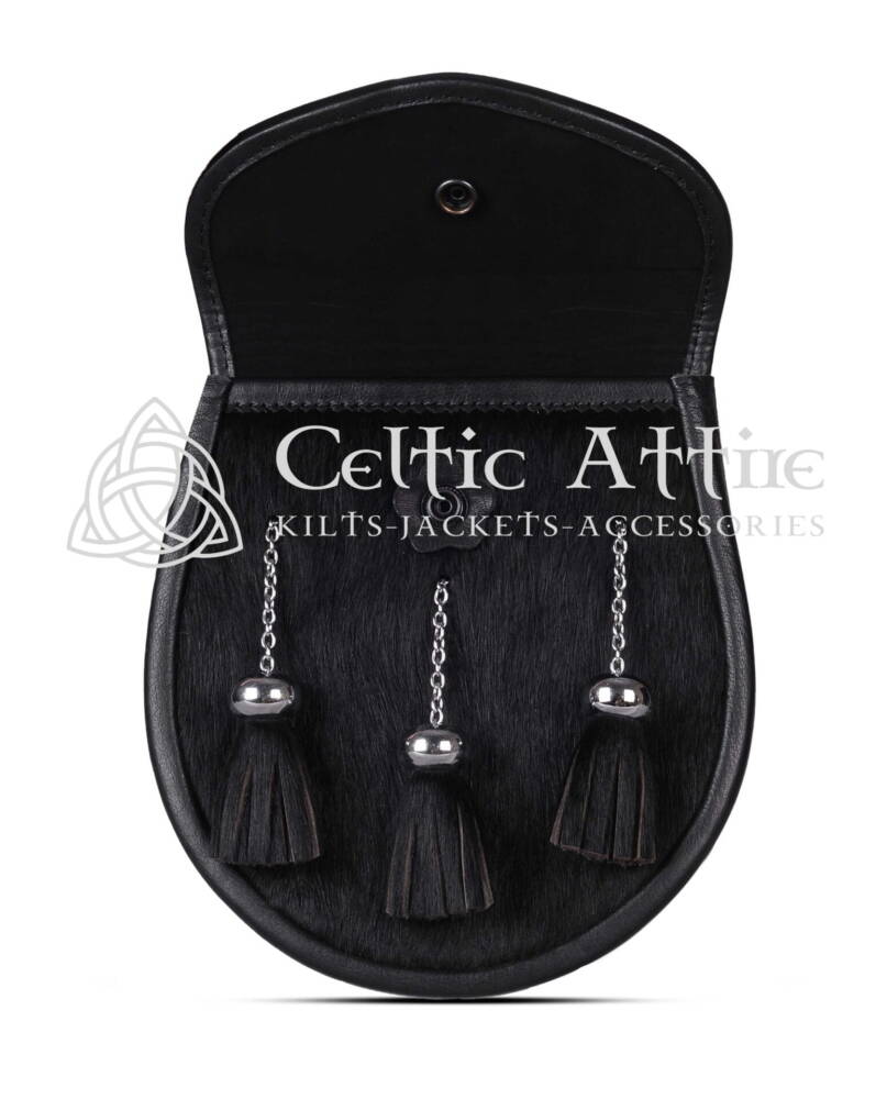 Elevate your Scottish attire with the Real Leather Scottish Semi Dress Black Bovine Fur Sporran, a perfect blend of elegance and tradition. Crafted from luxurious black bovine fur, this sporran offers a soft and plush texture that enhances the overall sophistication of your ensemble. The harmonized elegance of the black fur with the black leather body creates a visually appealing accessory that complements any kilt. Adorned with ornate chrome 3 tassel balls, it’s elegance strikes as a symbol of Scottish pride and resilience. This sporran is not only stylish but also rich in cultural significance. Semi Dress Sporrans are popular as you can wear them at formal or informal Scottish events or even as daily wear.
