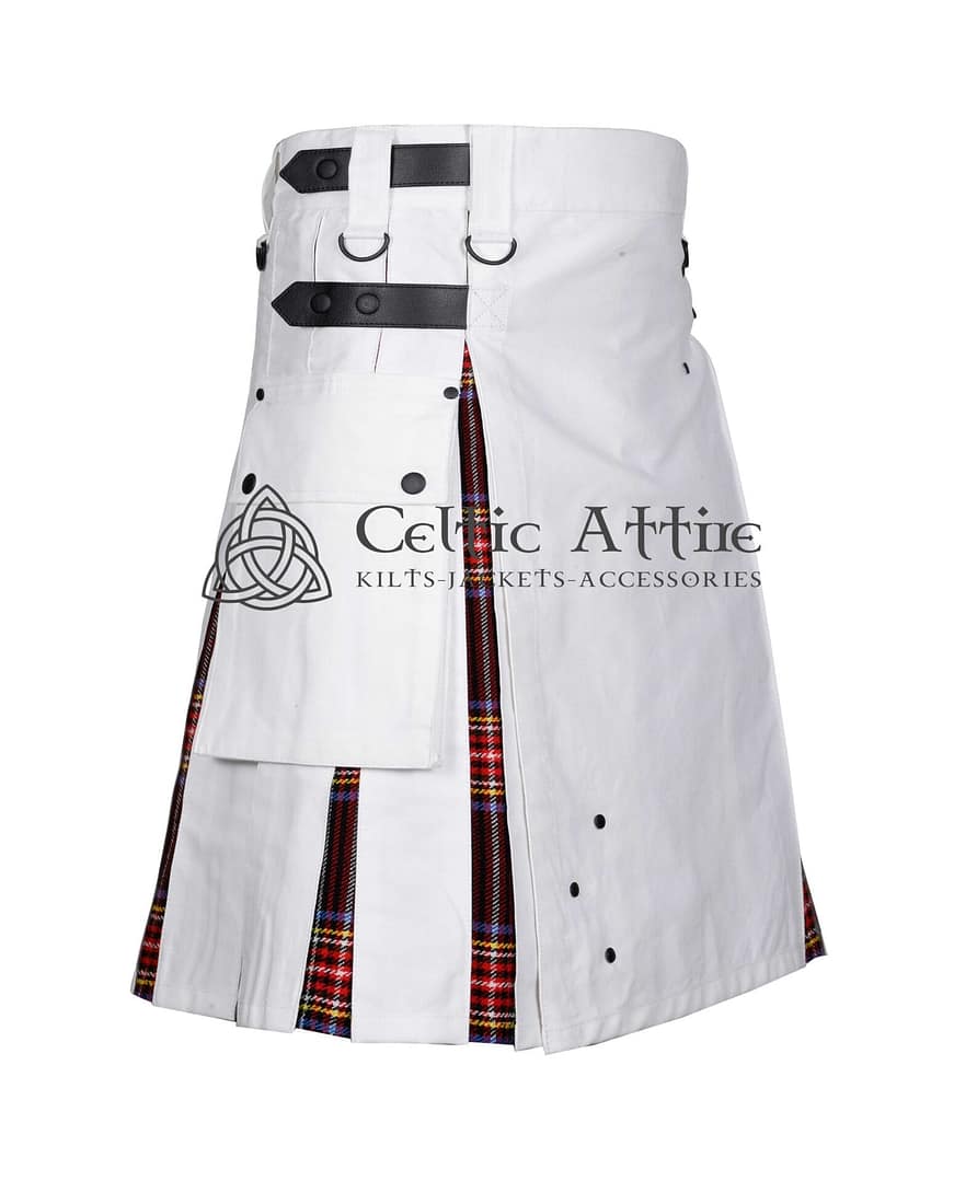 Versatility is a standout feature of the White Cotton Stewart Black Tartan Hybrid Kilt. Whether you’re attending outdoor festivals, family gatherings, or casual outings, this kilt adapts effortlessly to your style. Pair it with a simple black or white t-shirt for a laid-back look, or dress it up with a stylish button-down shirt for more formal occasions. Its adaptable design makes it a staple in any wardrobe.