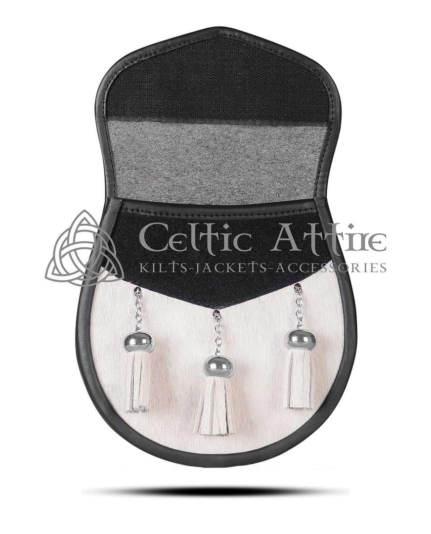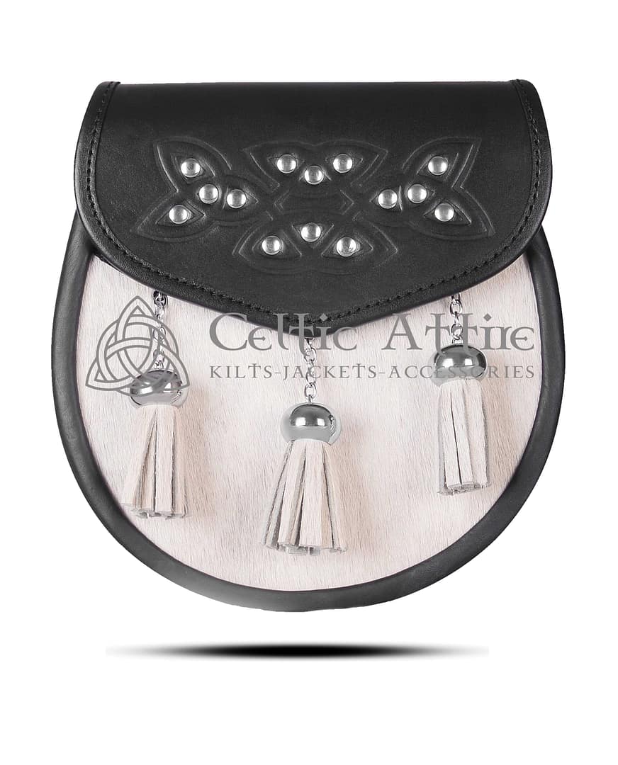 Elevate your Scottish attire with the Semi Dress Real Leather White Fur Scottish Sporran, a perfect blend of elegance and tradition. Crafted from luxurious white bovine fur, this sporran offers a soft and plush texture that enhances the overall sophistication of your ensemble. The striking contrast of the white fur against the black leather body creates a visually appealing accessory that complements any kilt. Adorned with ornate chrome 3 tassel balls, it’s elegance strikes as a symbol of Scottish pride and resilience. This sporran has celtic knots embossed pattern on the flap. This sporran is not only stylish but also rich in cultural significance. Semi Dress Sporrans are popular as you can wear them at formal or informal Scottish events or even as daily wear.