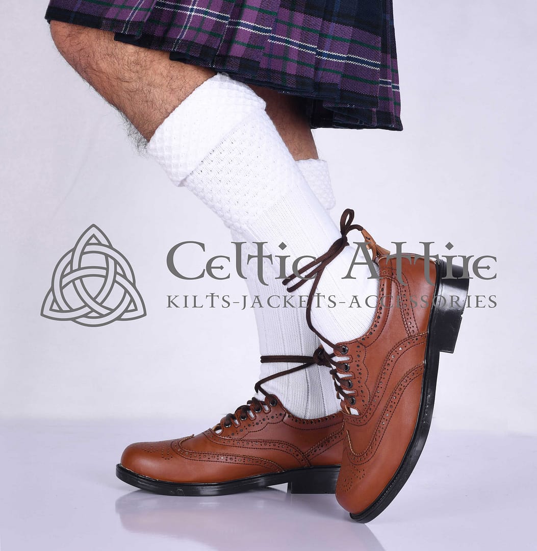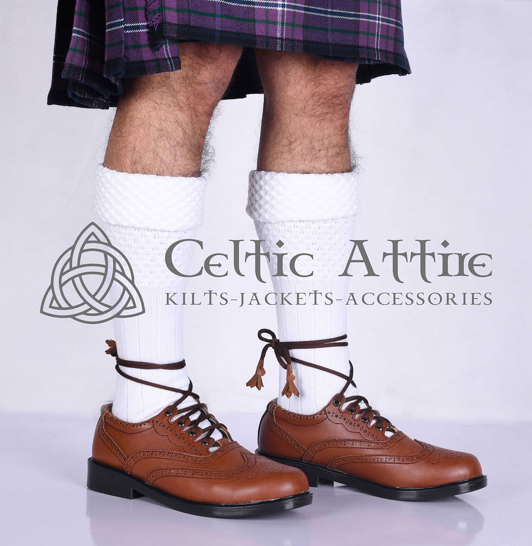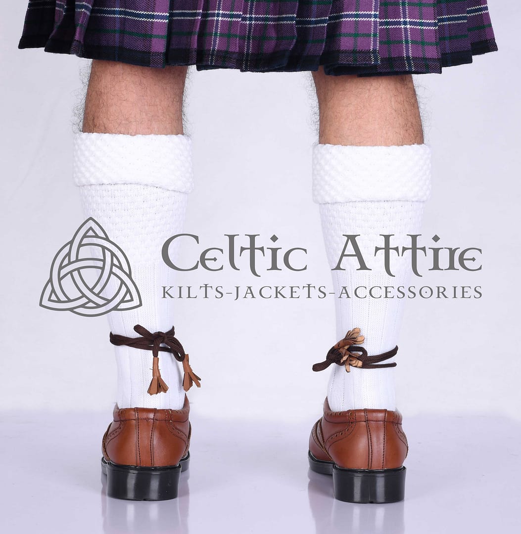 Whether you’re attending a wedding, a ceilidh, or simply dressing up for everyday wear, White Kilt Socks are a must-have accessory. Pair them with ghillie brogues to complete your authentic Highland look. Available in a range of sizes, these socks cater to every need, ensuring a comfortable fit for all. Experience the perfect balance of tradition and modern craftsmanship with these beautifully designed socks. They are a staple for any kilt outfit, adding a refined touch to your wardrobe. Perfect for gifting or personal use, White Kilt Socks are a timeless addition to any collection.