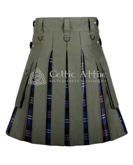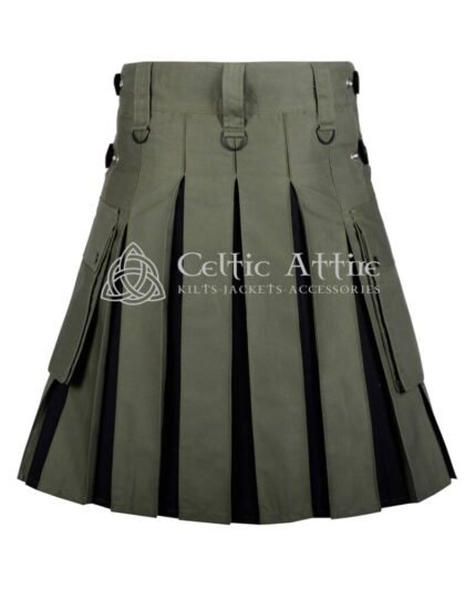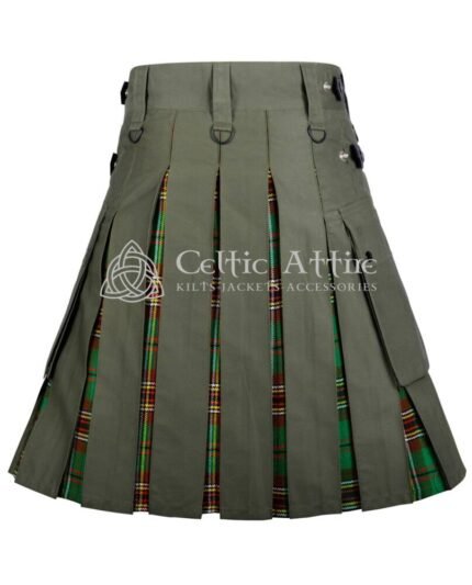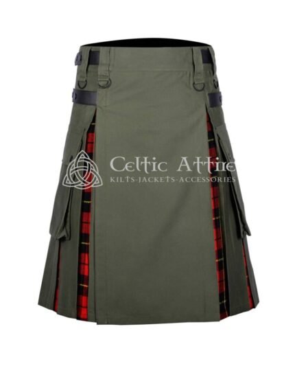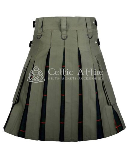 Olive Green Cotton Black Tartan Hybrid Utility Kilt